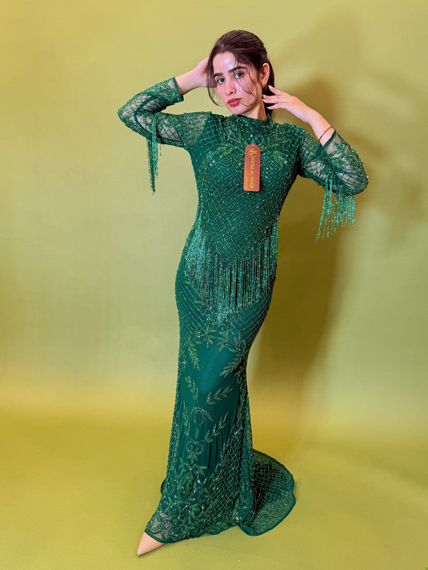 Drape yourself in elegance with this emerald masterpiece — where intricate beadwork, shimmering details, and timeless silhouette create a vision of modern royalty. Every stitch whispers luxury, every glance commands attention.